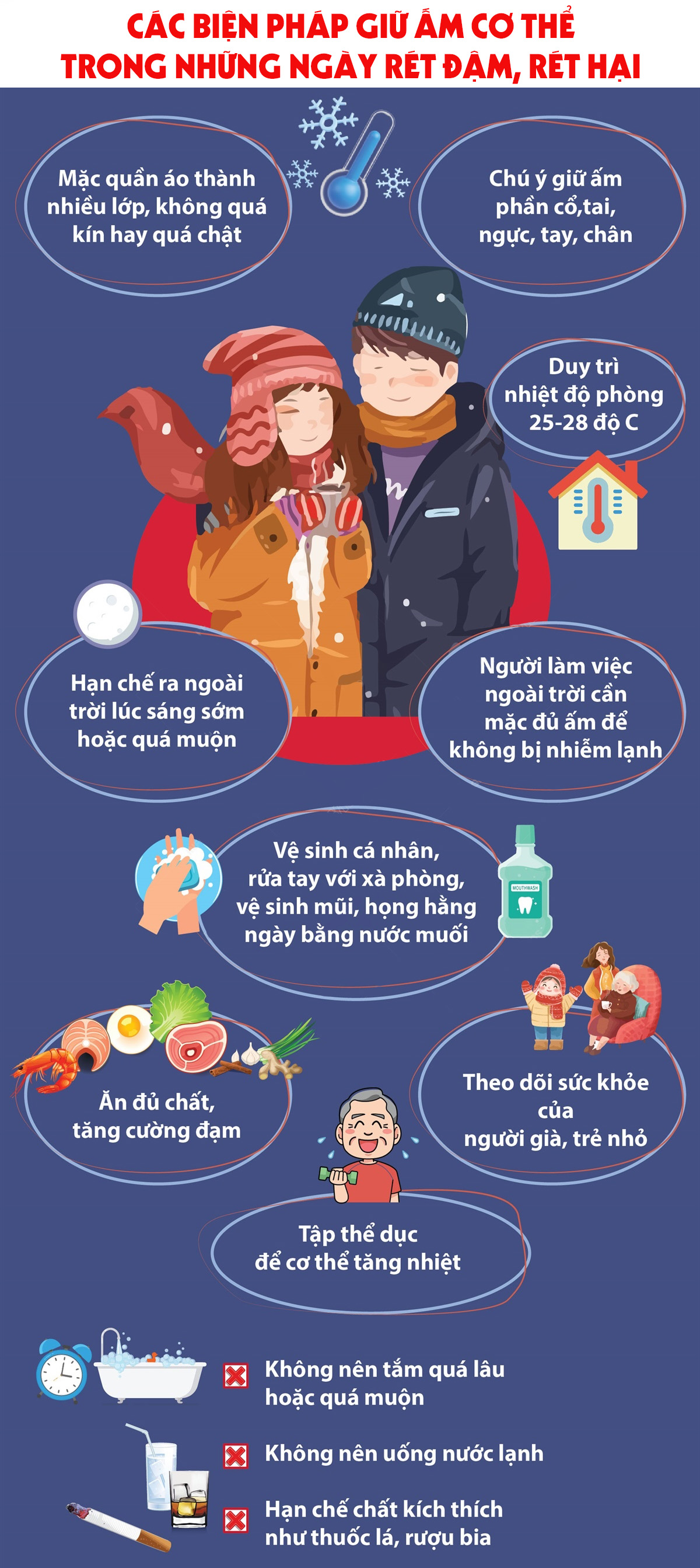 Thời tiết lạnh gây ảnh hưởng lớn đến sức khỏe, nhất là người già và trẻ em. Trong những ngày rét đậm, nếu không có việc cần thiết, nên tránh đi ra ngoài trời lạnh, mặc nhiều lớp áo để giữ ấm, tránh uống đồ lạnh, đồ uống có cồn, giữ ấm cơ thể, ăn uống đầy đủ… là những cách nên làm để giữ ấm khi trời lạnh.