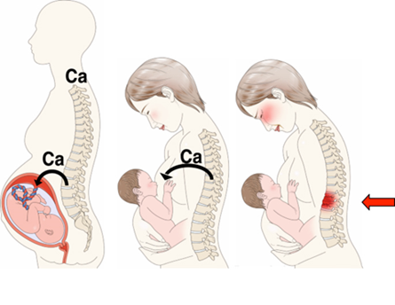 Ở giai đoạn cho bú, cơ thể người mẹ tăng tiết hormone prolactin và giảm estrogen. Estrogen có vai trò bảo vệ xương; khi giảm xuống mức thấp, quá trình hủy xương diễn ra mạnh hơn. Đồng thời, hormone PTHrP (parathyroid hormone-related protein) tăng lên để điều chỉnh canxi huy động từ xương vào sữa, vô tình làm tăng tốc độ mất xương.