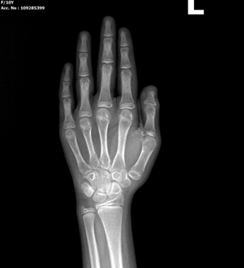 Hình ảnh trẻ nữ 10 tuổi có hình ảnh tuổi xương trên Xquang bàn tay trái tương đương trẻ nữ 11-12 tuổi