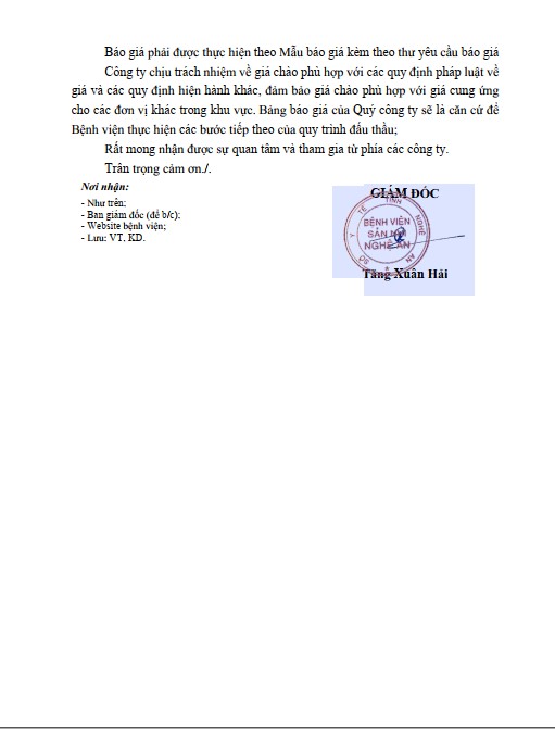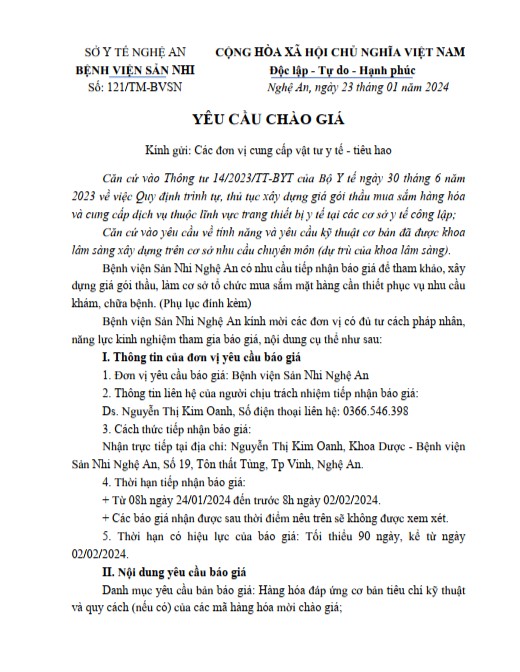 Thông báo yêu cầu chào giá số 121/TM-BVSN ngày 23 tháng 1 năm 2024