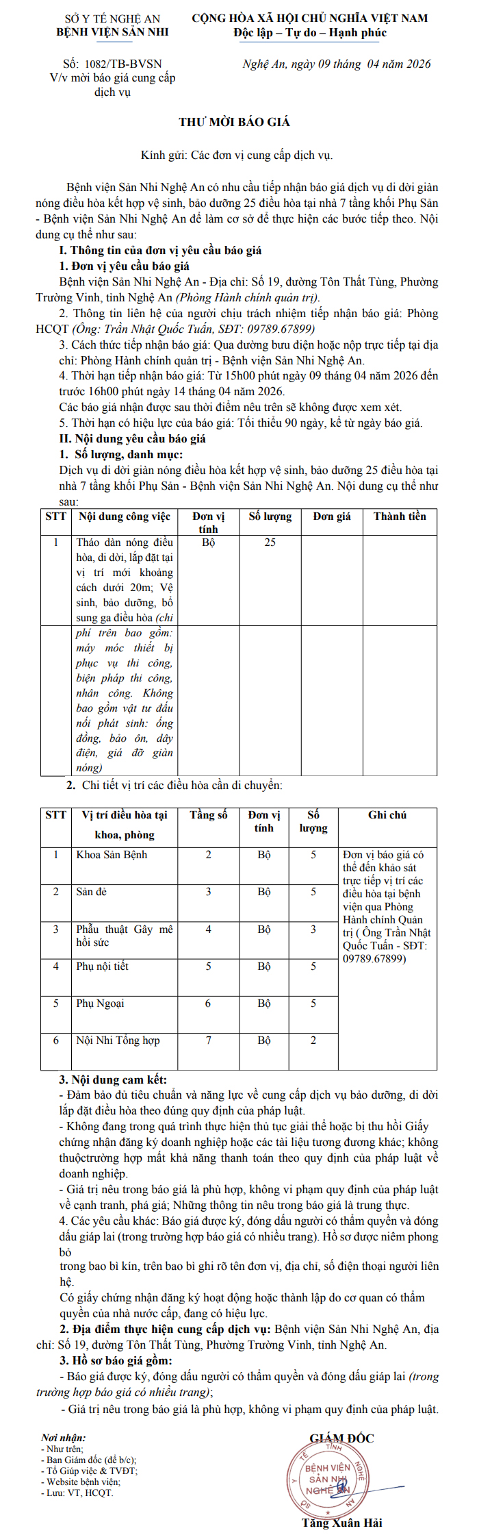 Thông báo thư mời báo giá số 1082/TM-BVSN ngày 09 tháng 4 năm 2026