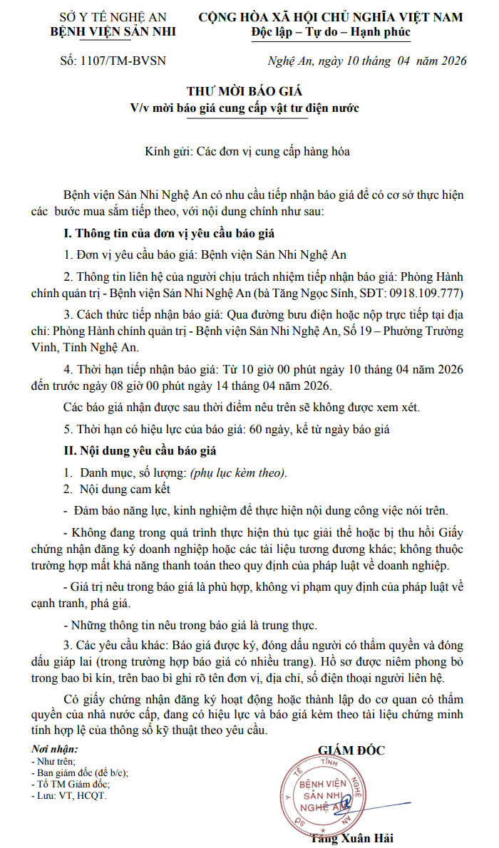 Thông báo thư mời báo giá số 1107/TM-BVSN ngày 10 tháng 4 năm 2026