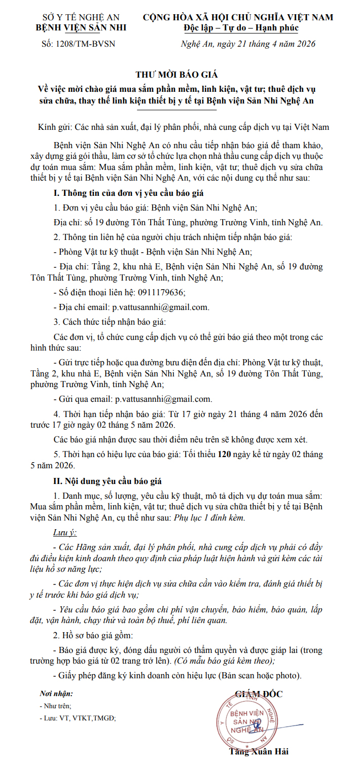 Thông báo thư mời báo giá số 1208/TM-BVSN ngày 21 tháng 4 năm 2026