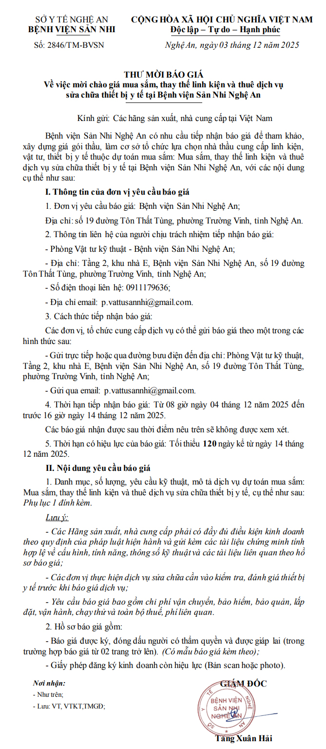 Thông báo thư mời báo giá số 2846/TM-BVSN ngày 03 tháng 12 năm 2025