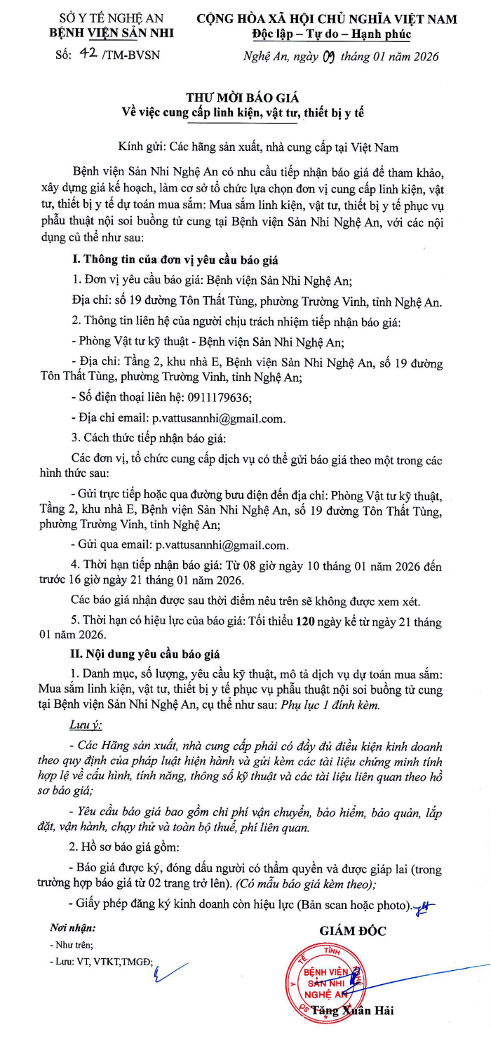 Thông báo thư mời báo giá số 42/TM-BVSN ngày 09 tháng 01 năm 2025
