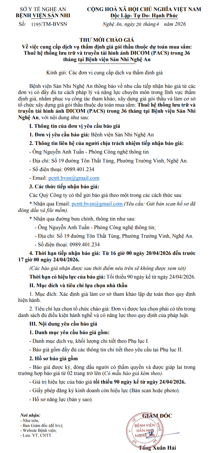 Thông báo thư mời chào giá số 1195/TM-BVSN ngày 20 tháng 4 năm 2026