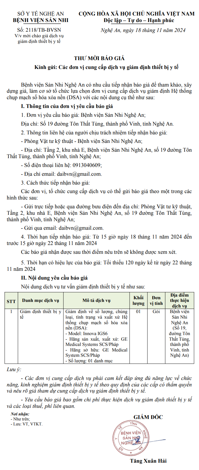 Thông báo Thư mời chào giá số 2118/TB-BVSN ngày 18 tháng 11 năm 2024