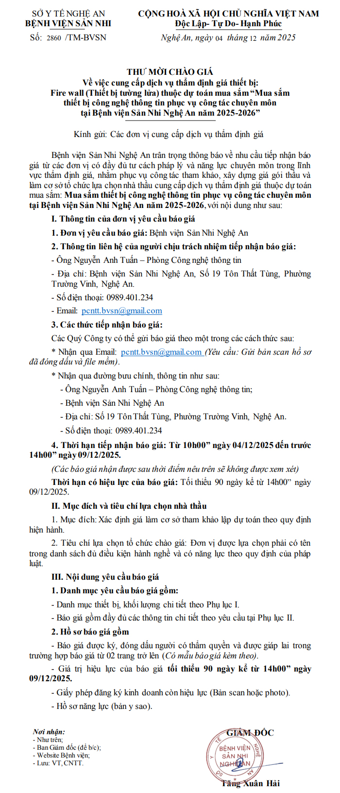 Thông báo Thư mời chào giá số 2860/TM-BVSN ngày 04 tháng 12 năm 2025