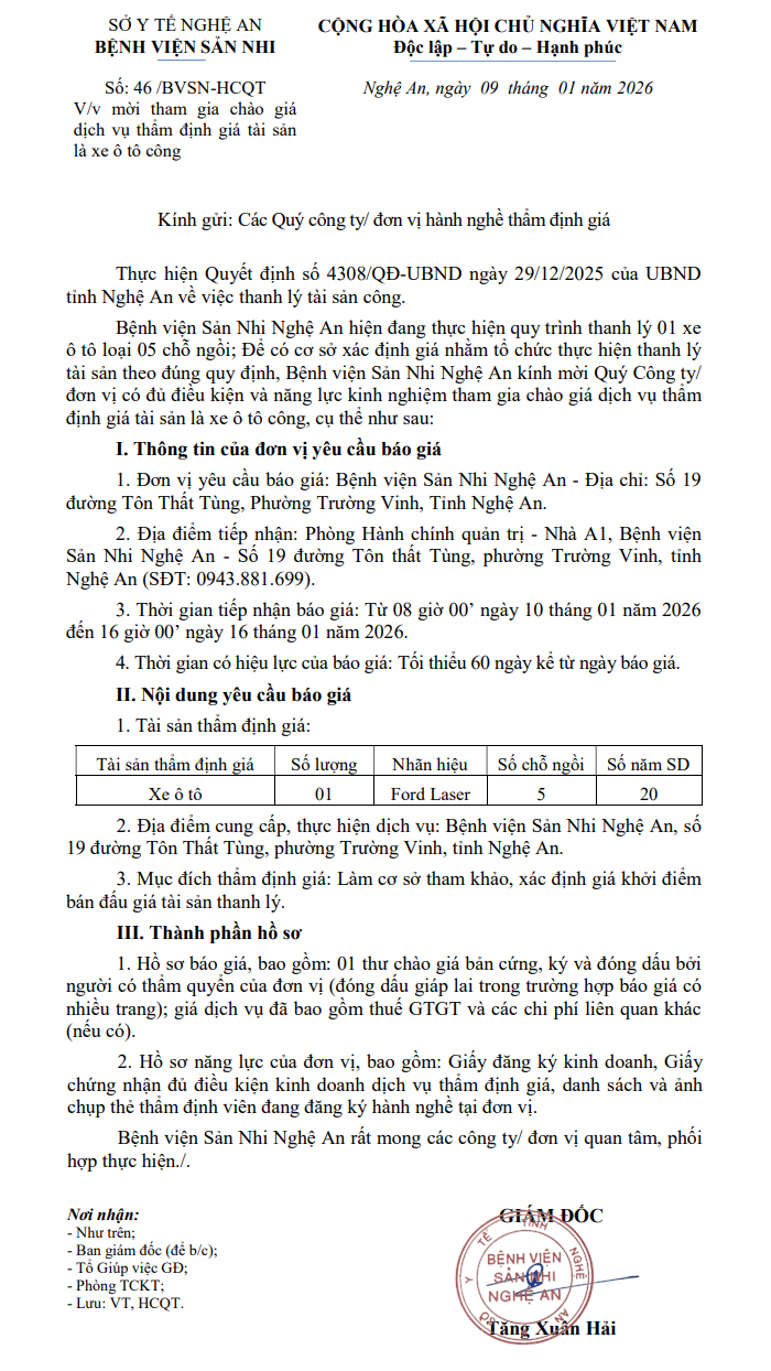 Thông báo thư mời chào giá số 46/TM-BVSN ngày 09 tháng 01 năm 2025