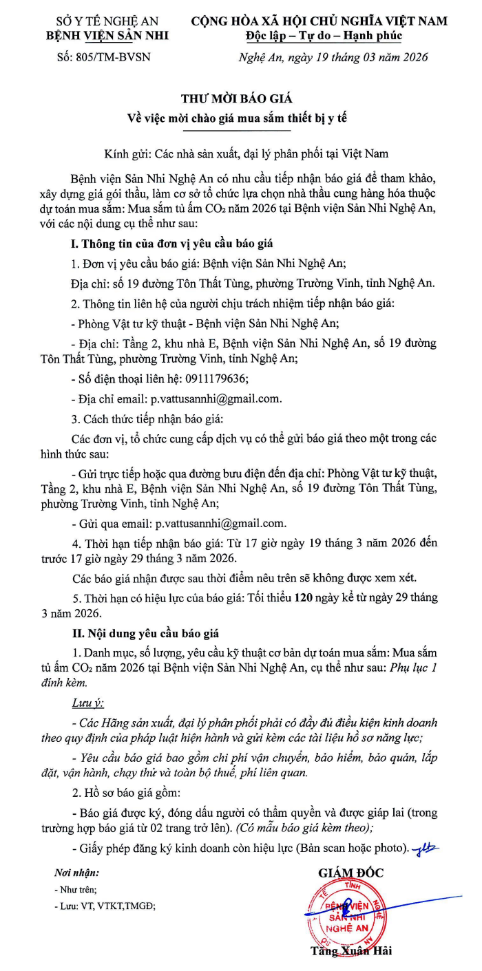 Thông báo thư mời chào giá số 805/TM-BVSN ngày 19 tháng 03 năm 2026