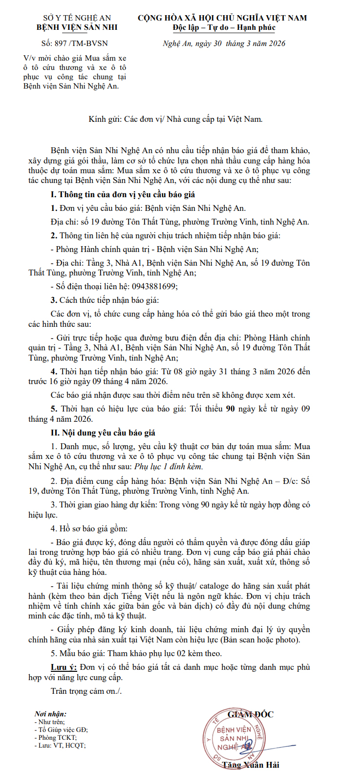 Thông báo thư mời chào giá số 897/TM-BVSN ngày 31 tháng 3 năm 2026