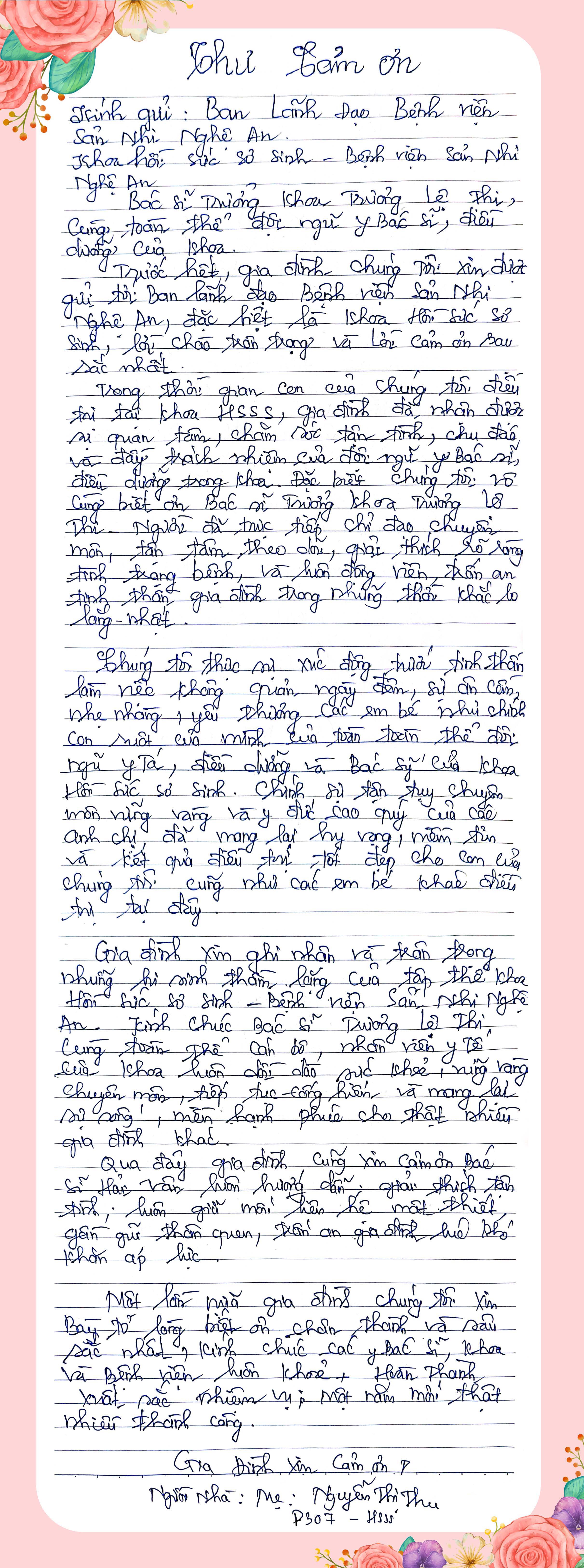 Thư cảm ơn Khoa Hồi sức cấp cứu sơ sinh