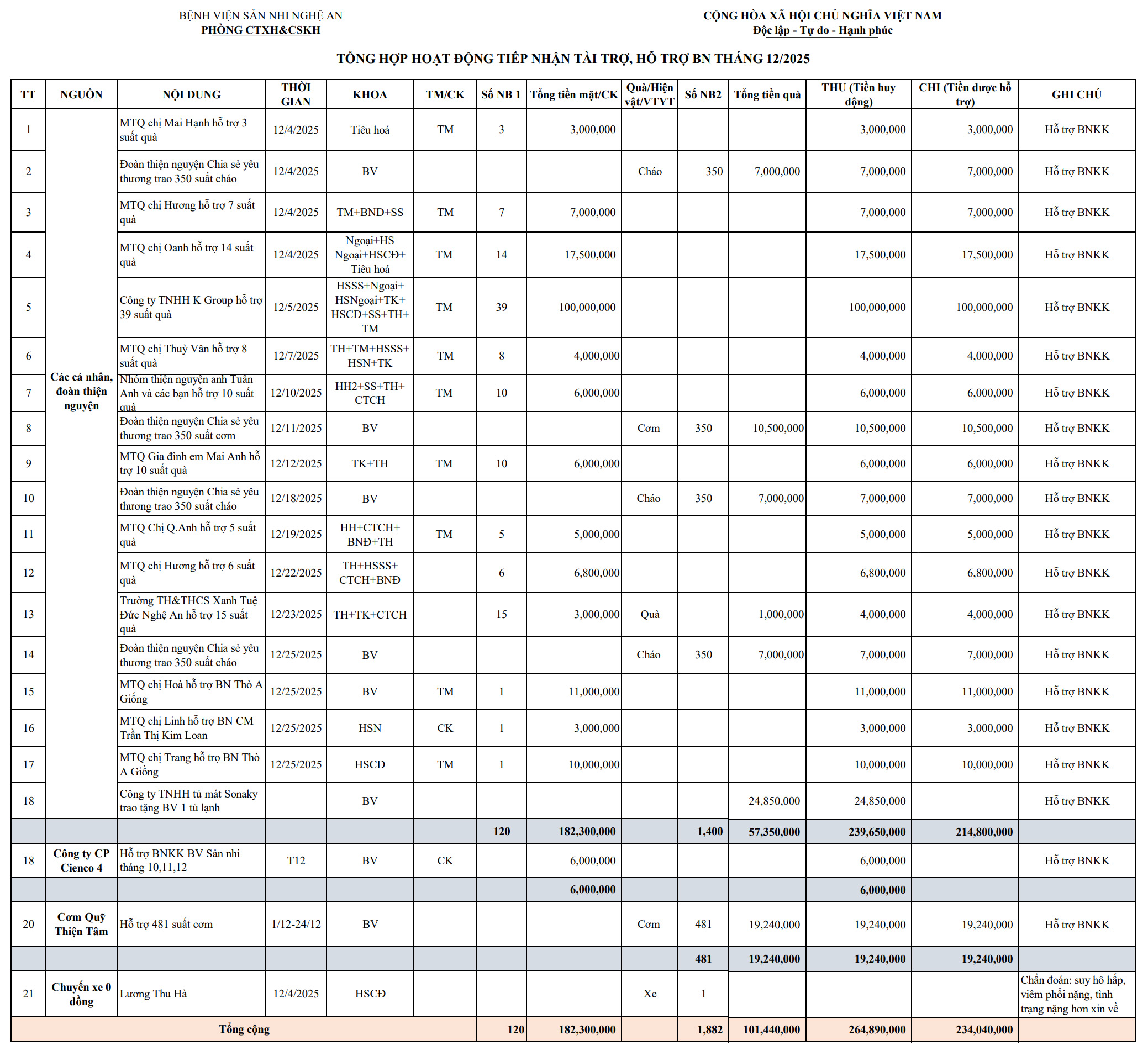Tổng hợp danh sách tài trợ, hỗ trợ người bệnh tháng 12 năm 2025