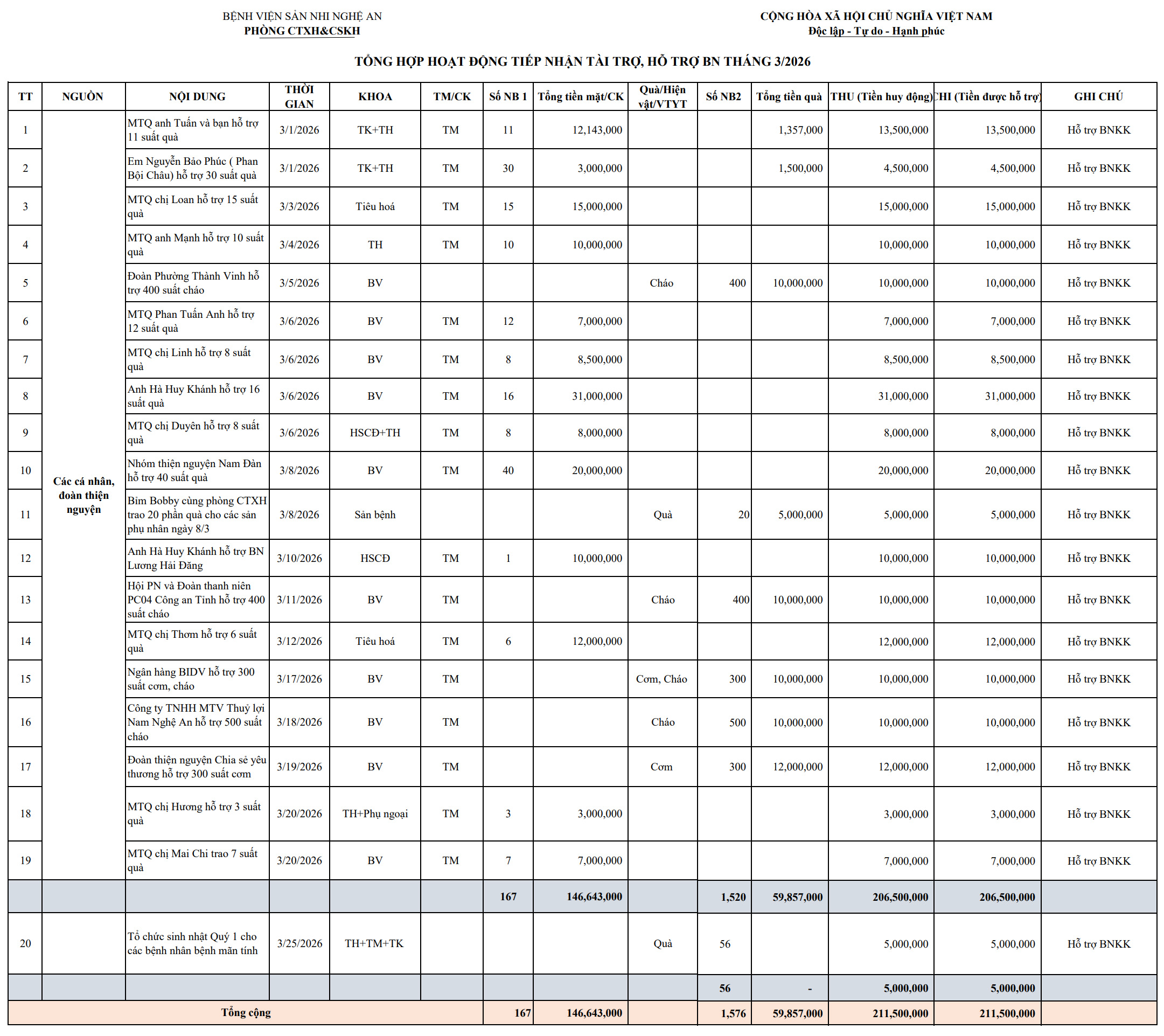 Tổng hợp danh sách tài trợ, hỗ trợ người bệnh tháng 3 năm 2026