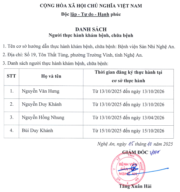 Danh sách Người thực hành khám bệnh, chữa bệnh đến ngày 15 tháng 10 năm 2025