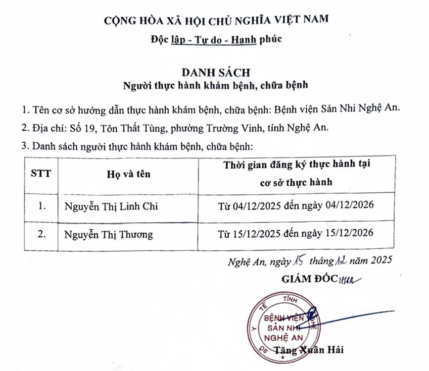 Danh sách Người thực hành khám bệnh, chữa bệnh đến ngày 15 tháng 12 năm 2025
