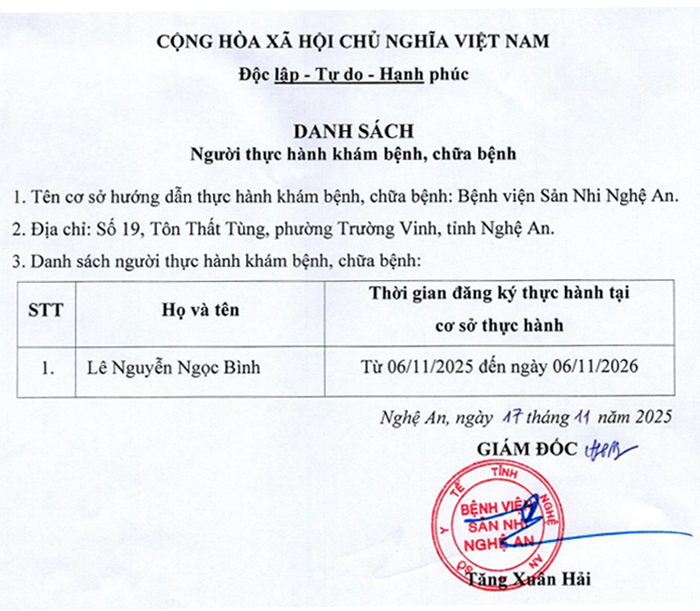 Danh sách Người thực hành khám bệnh, chữa bệnh đến ngày 17 tháng 11 năm 2025