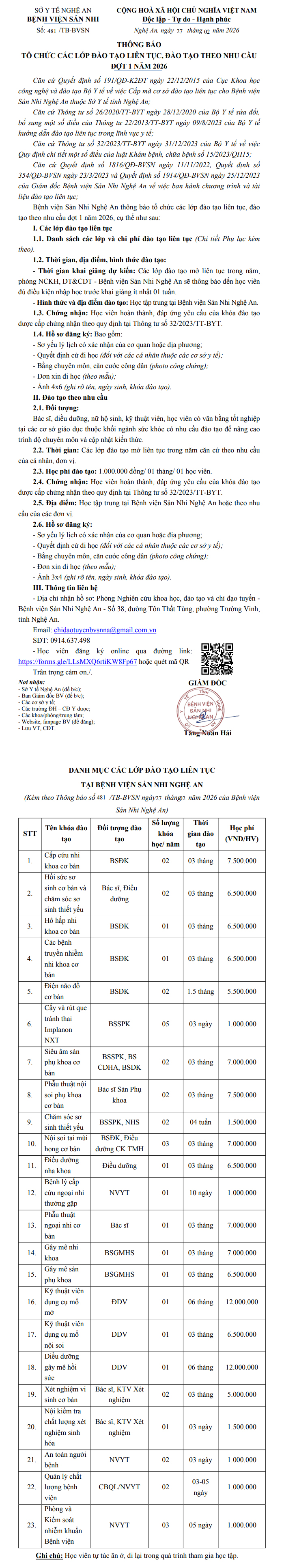 Thông báo tổ chức các lớp đào tạo liên tục, đào tạo theo nhu cầu đợt 1 năm 2026