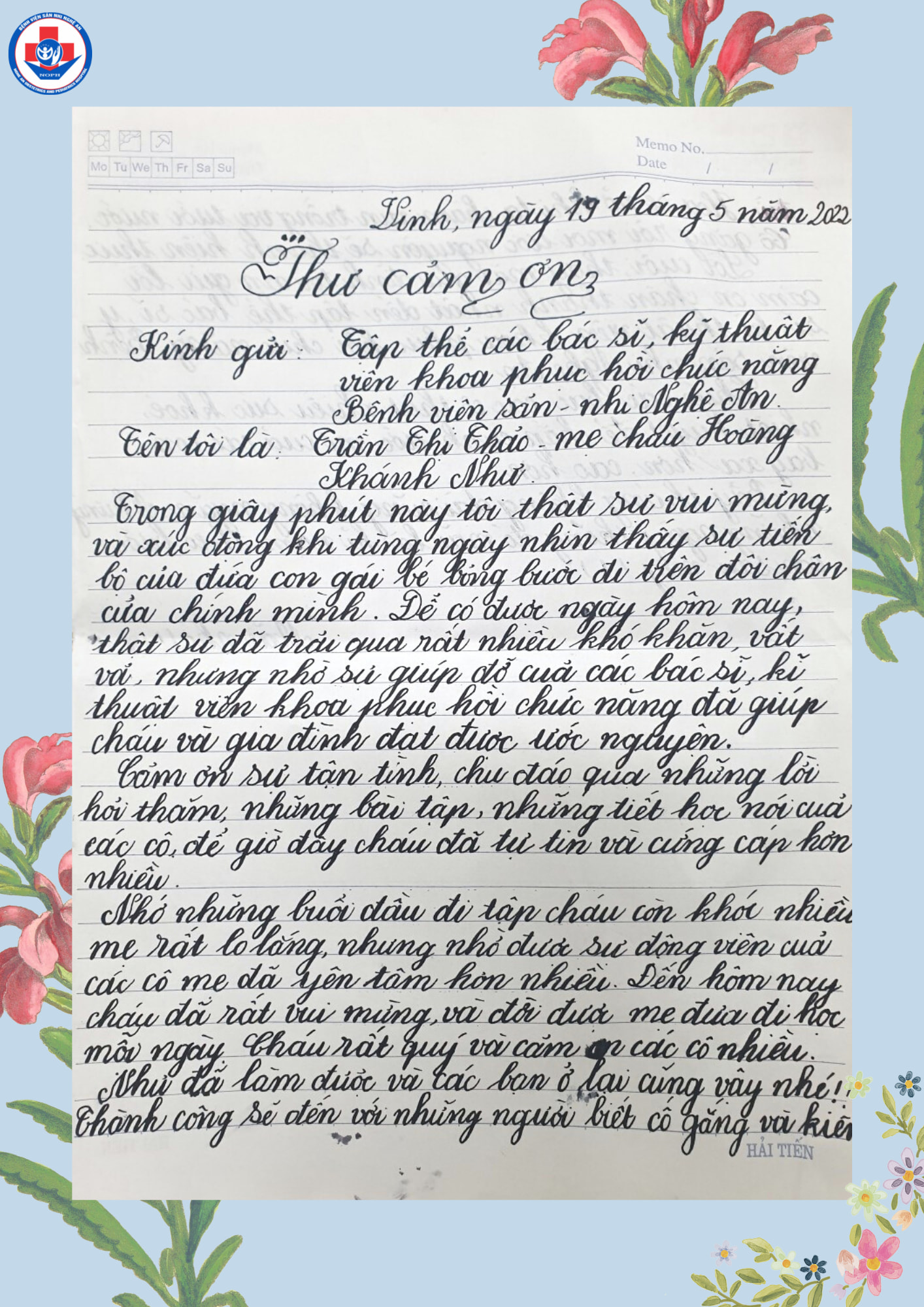 Thư cảm ơn của bệnh nhân khoa Thần kinh - Phục hồi chức năng