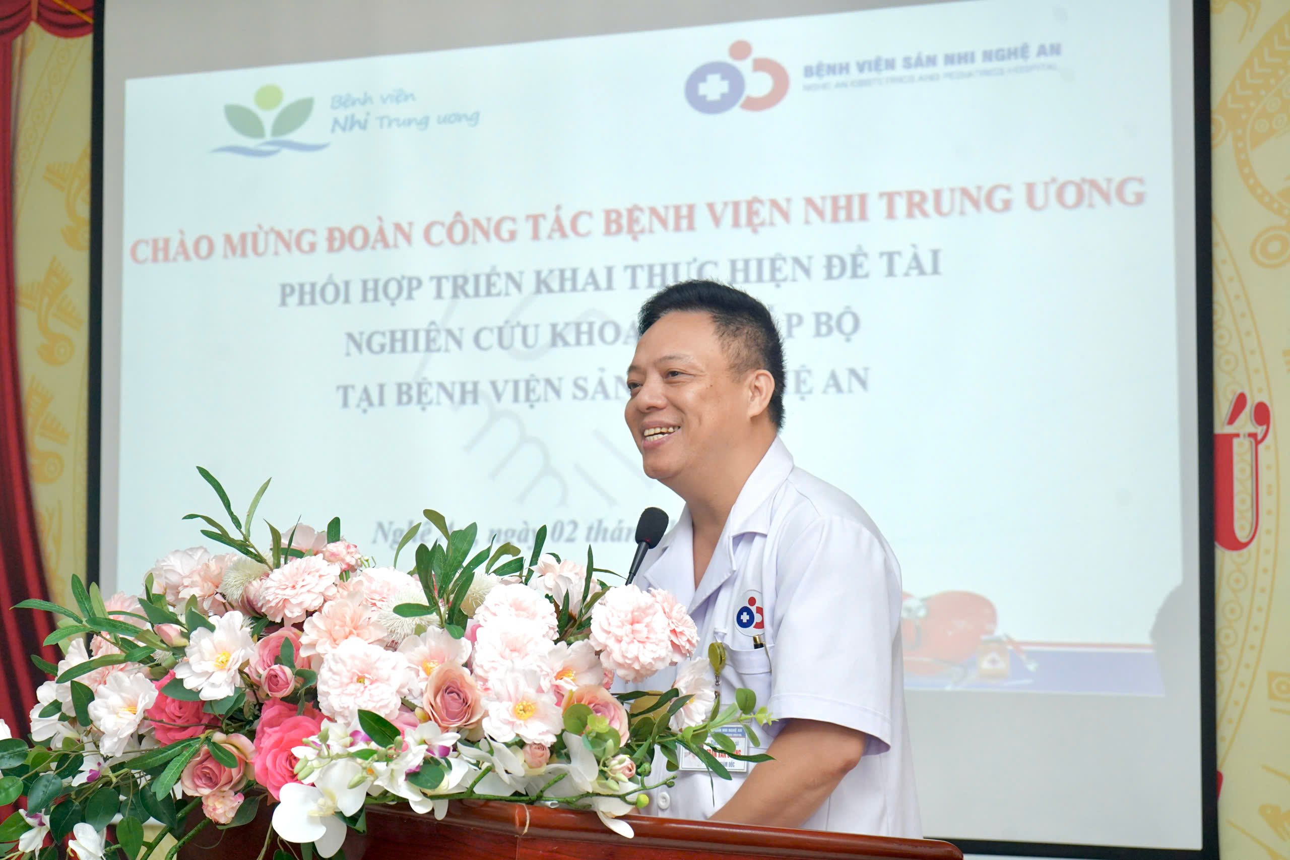 Phát biểu tại buổi làm việc, TS.BSNT Trần Văn Cương - Phó Giám đốc Bệnh viện Sản Nhi Nghệ An gửi lời cảm ơn đoàn công tác Bệnh viện Nhi Trung ương đã tin tưởng lựa chọn bệnh viện tham gia đề tài. Đồng thời khẳng định: “Bệnh viện Sản Nhi Nghệ An sẽ hỗ trợ tối đa nguồn lực, bố trí nhân sự và cơ sở vật chất đáp ứng đầy đủ yêu cầu nghiên cứu. Đây là cơ hội quan trọng để đội ngũ cán bộ y tế được nâng cao kiến thức, tiếp cận các phương pháp kiểm soát nhiễm khuẩn hiện đại, từ đó phục vụ tốt hơn công tác chăm sóc và bảo vệ sức khỏe nhân dân trên địa bàn tỉnh nhà.”