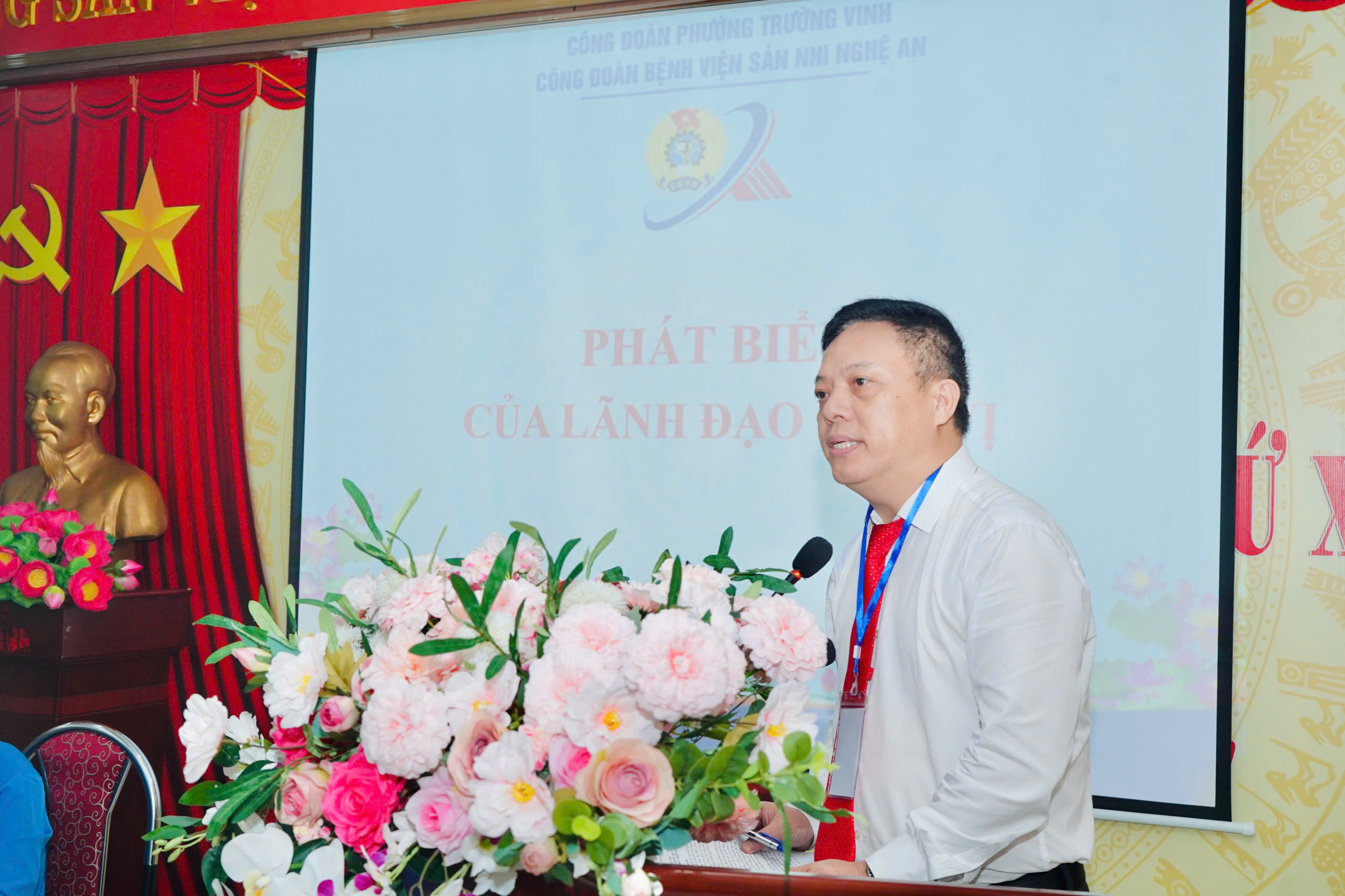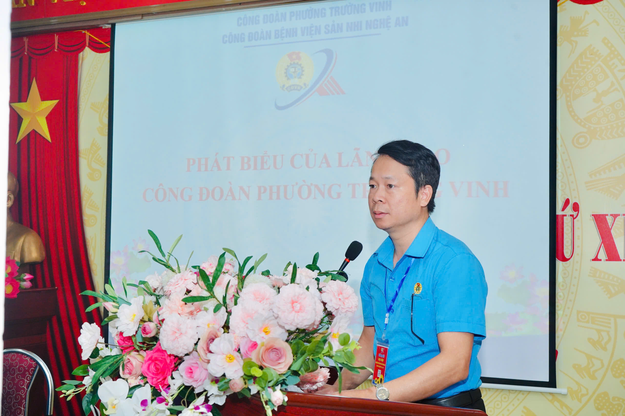 Phát biểu tại đại hội, biểu dương những thành tích hoạt động của CĐCS Bệnh viện Sản Nhi Nghệ An trong nhiệm kỳ qua, Đ/c Lê Xuân Trình - Phó CT Mặt trận Tổ quốc, CT Công đoàn Phường Trường Vinh ghi nhận công tác chuẩn bị chu đáo của đại hội. Nhiệm kỳ vừa qua, Công đoàn BV Sản Nhi Nghệ An đã có nhiều hoạt động đổi mới phương thức hoạt động công đoàn mạnh mẽ, đem lại kết quả tốt đẹp như: tổ chức các hoạt động giao lưu thể thao văn hóa tăng cường gắn kết với các đơn vị bạn; Tổ chức các buổi đối thoại cán bộ viên chức lao động, nắm tâm tư nguyện vọng, hiến kế xây dựng Bệnh viện từ CBNV; Chăm lo đời sống vật chất tinh thần, liên tục tổ chức các hoạt động văn nghệ thể thao; Hoạt động nữ công, bình đẳng giới được BV chú trọng. Phong trào thi đua lao động giỏi của BV luôn được chú trọng với những Hội nghị khoa học, hội thảo chuyên ngành Sản – Nhi được diễn ra thành công, và nhiều đề tài khoa học cấp Tỉnh, cùng các cuộc thi của ngành, BV đều đạt giải cao.
