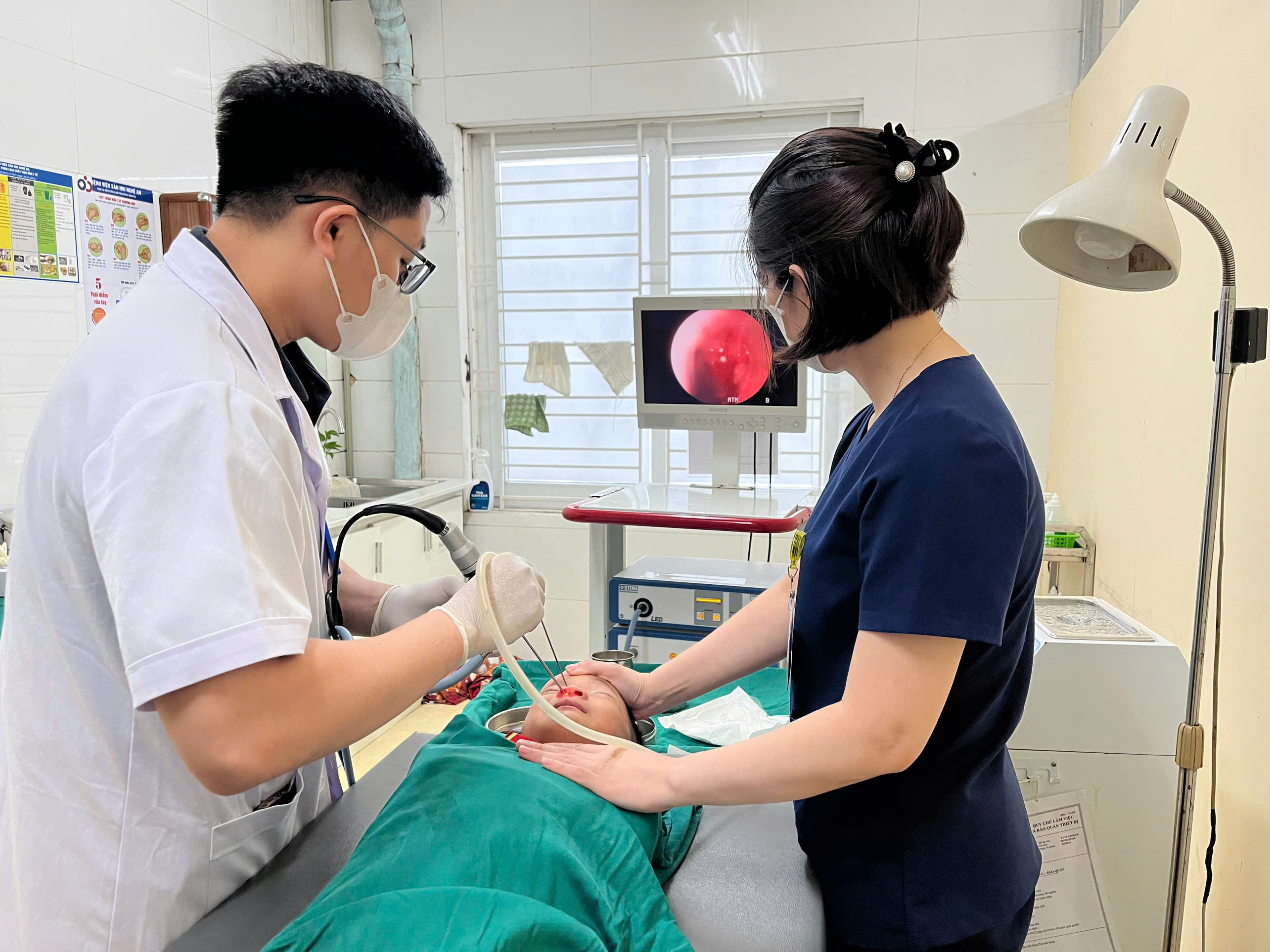 Qua thăm khám, các bác sĩ phát hiện vật thể lạ lớn nằm sâu trong hốc mũi phải. Vì vật thể lạ để lâu trong mũi nên đã mủn nát, gây viêm loét niêm mạc và nhiễm trùng lan rộng. Các bác sĩ đã tiến hành nội soi gắp dị vật. Kết quả là nhiều mảnh vỡ của dị vật không rõ bản chất. Sau gắp dị vật, trẻ được điều trị kháng sinh, xịt mũi, rửa mũi tích cực, đến nay trẻ tỉnh táo, hết ngạt mũi, hết chảy máu mũi.