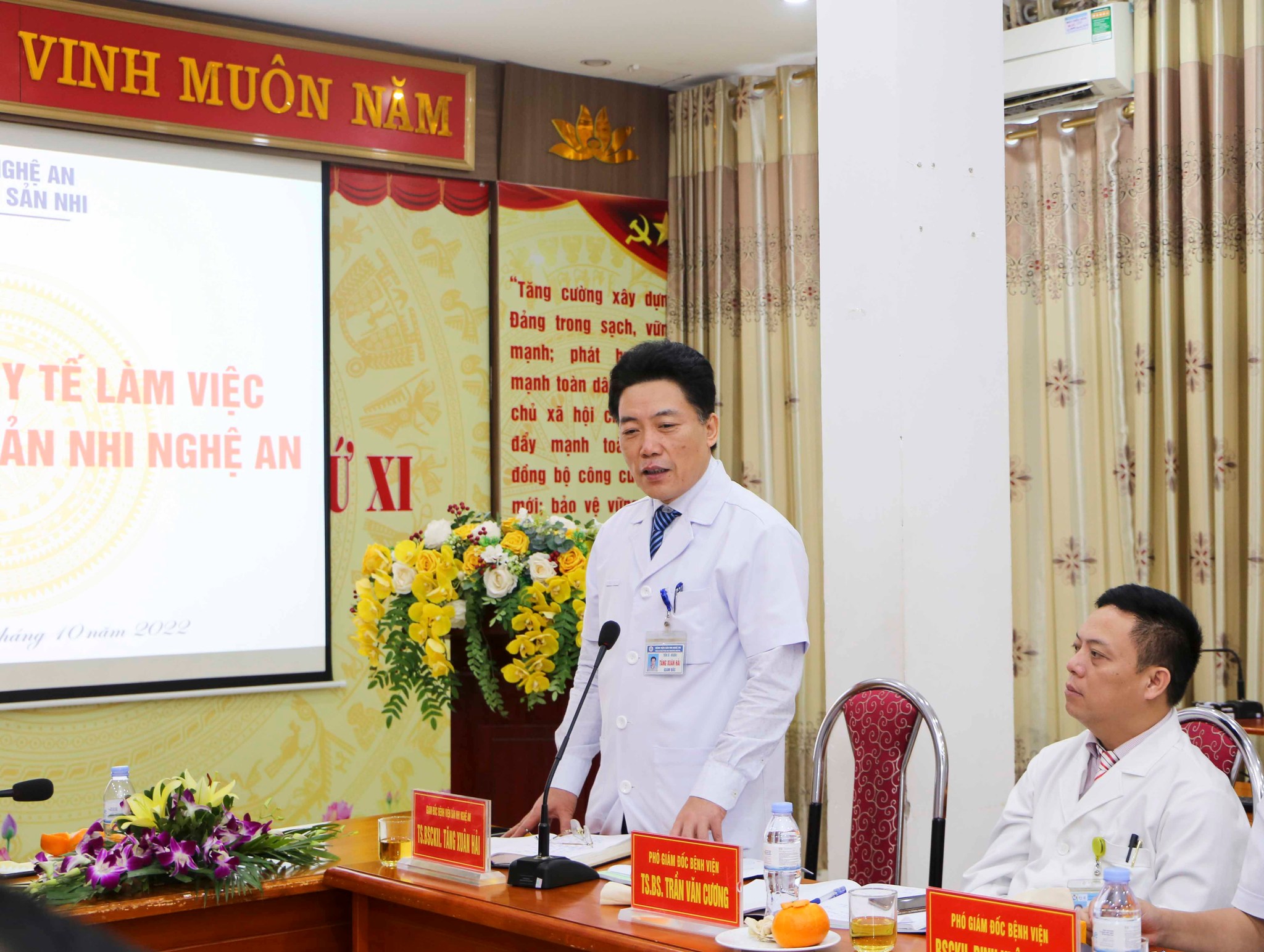 Chiều ngày 13/10/2022, Đoàn công tác của Sở Y tế Nghệ An do PGS.TS Dương Đình Chỉnh - Ủy viên BCH Đảng bộ Tỉnh, Giám đốc Sở Y tế làm trưởng đoàn đã đến thăm và làm việc tại Bệnh viện Sản Nhi Nghệ An. Tham gia cùng đoàn công tác còn có DS CKII. Trần Minh Tuệ - Phó Giám đốc Sở Y tế, DS CKI. Thái Bá Thắng – Phó Giám đốc BHXH Nghệ An, BS CKI. Phạm Quốc Dương – Chủ tịch Công Đoàn ngành cùng các đồng chí Lãnh đạo Chi cục Dân số tỉnh, Trung tâm Kiểm soát bệnh tật tỉnh, Trưởng, Phó phòng, Ban, Văn phòng Sở Y tế. Về phía Bệnh viện Sản Nhi Nghệ An tiếp và làm việc với Đoàn có TS.BS CKII Tăng Xuân Hải – Bí thư Đảng ủy, Giám đốc Bệnh viện cùng các Đồng chí trong Đảng ủy, Ban giám đốc, Trưởng, phó các Khoa/Phòng/Trung tâm, Chủ tịch công đoàn, Bí thư Đoàn thanh niên Bệnh viện.