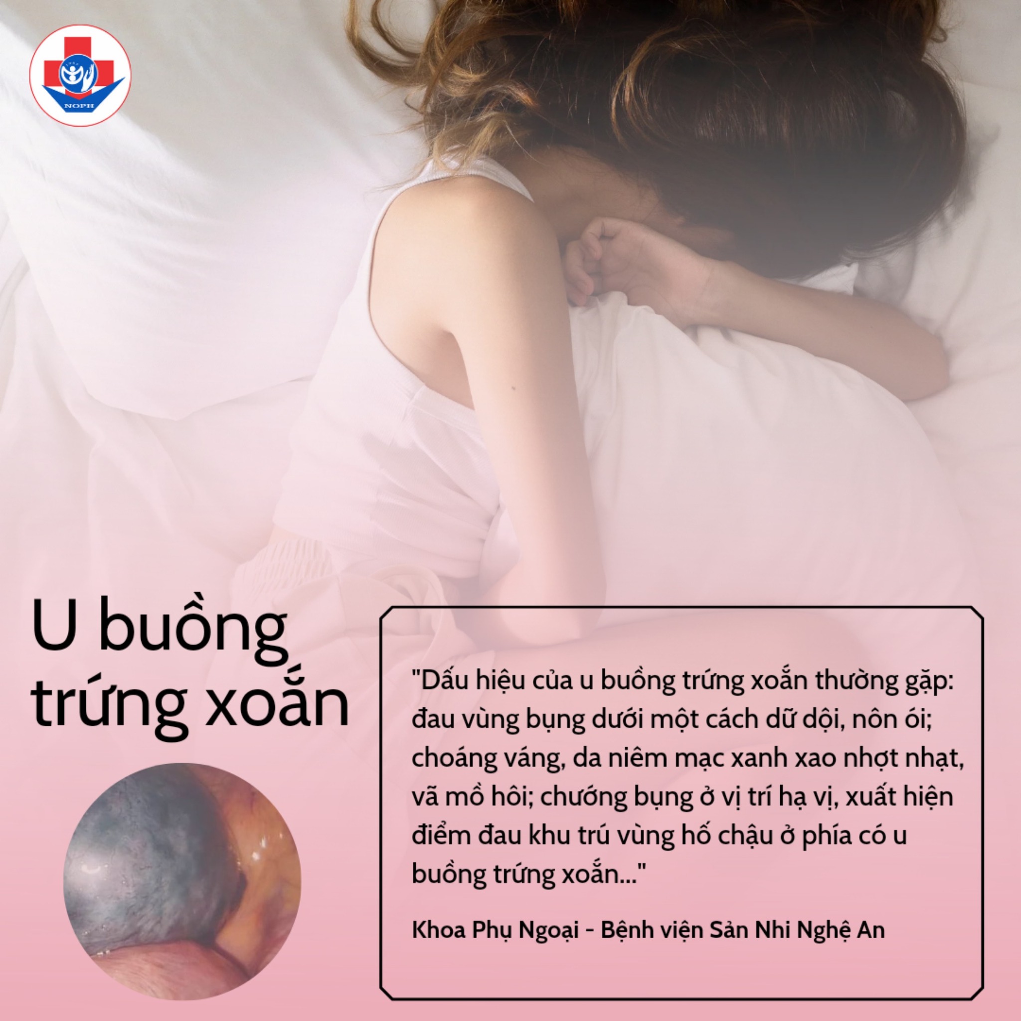 Bác sỹ khoa Phụ Ngoại khuyến cáo: Dấu hiệu của u buồng trứng xoắn có thế thường thấy đó là đau vùng bụng dưới một cách dữ dội, kèm theo tình trạng nôn ói; choáng váng, da niêm mạc xanh xao nhợt nhạt, vã mồ hôi, hoảng sợ; chướng bụng ở vị trí hạ vị, xuất hiện điểm đau khu trú vùng hố chậu ở phía có u buồng trứng xoắn. Người bệnh có thể có cảm giác mắc tiểu, đi tiểu rắt, tiểu khó do u di chuyển chèn ép bàng quang, hoặc bị táo bón do u chèn ép trực tràng, cũng có thể bị phù 2 chi dưới do u chèn ép hệ tĩnh mạch.