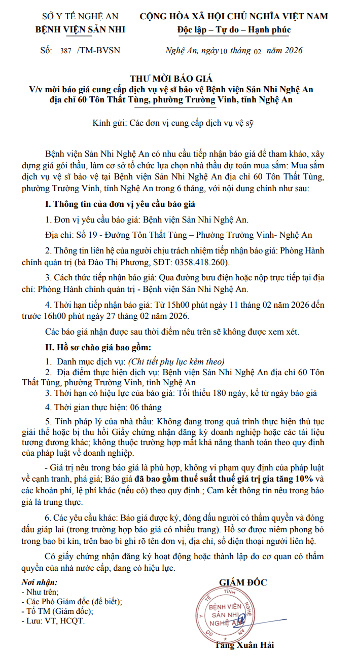 Thông báo thư mời báo giá số 387/TM-BVSN ngày 10 tháng 02 năm 2026