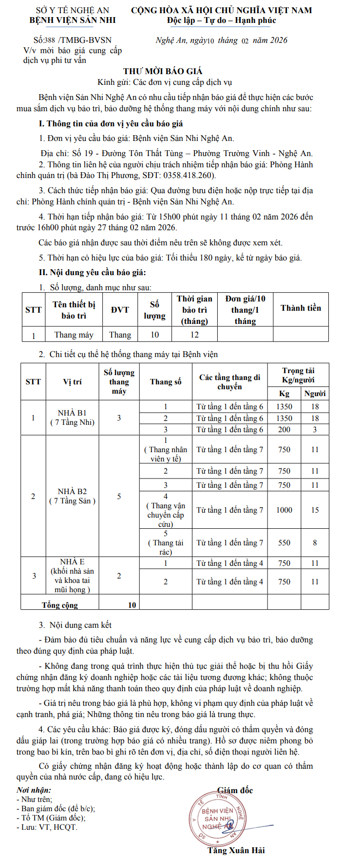 Thông báo thư mời báo giá số 388/TM-BVSN ngày 10 tháng 02 năm 2026