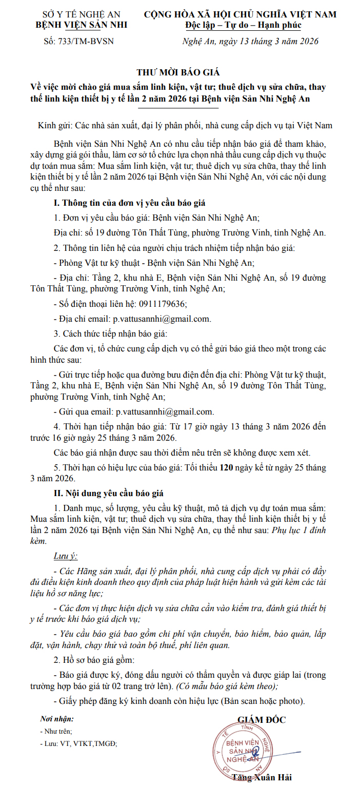 Thông báo thư mời báo giá số 733/TM-BVSN ngày 13 tháng 3 năm 2026