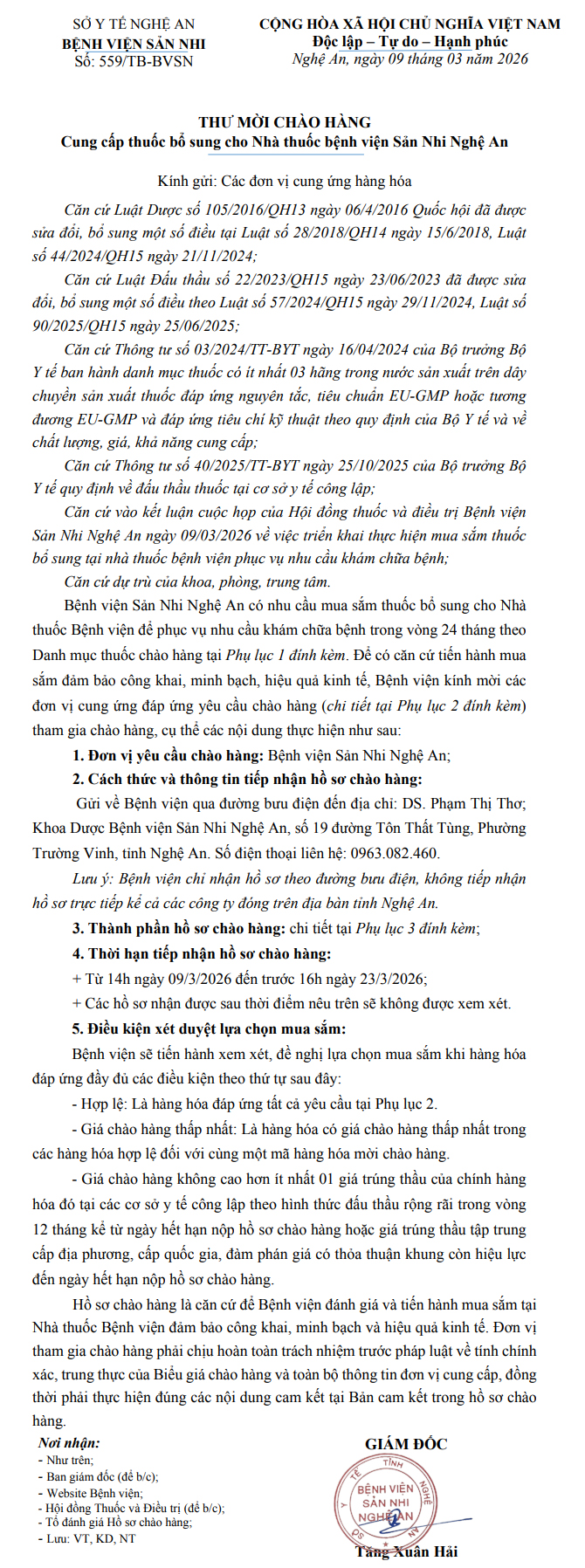 Thông báo thư mời chào hàng số 559/TB-BVSN ngày 09/3/2026