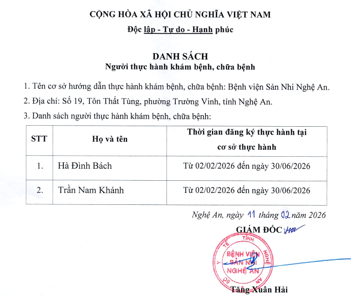 Danh sách Người thực hành khám bệnh, chữa bệnh đến ngày 11 tháng 02 năm 2026