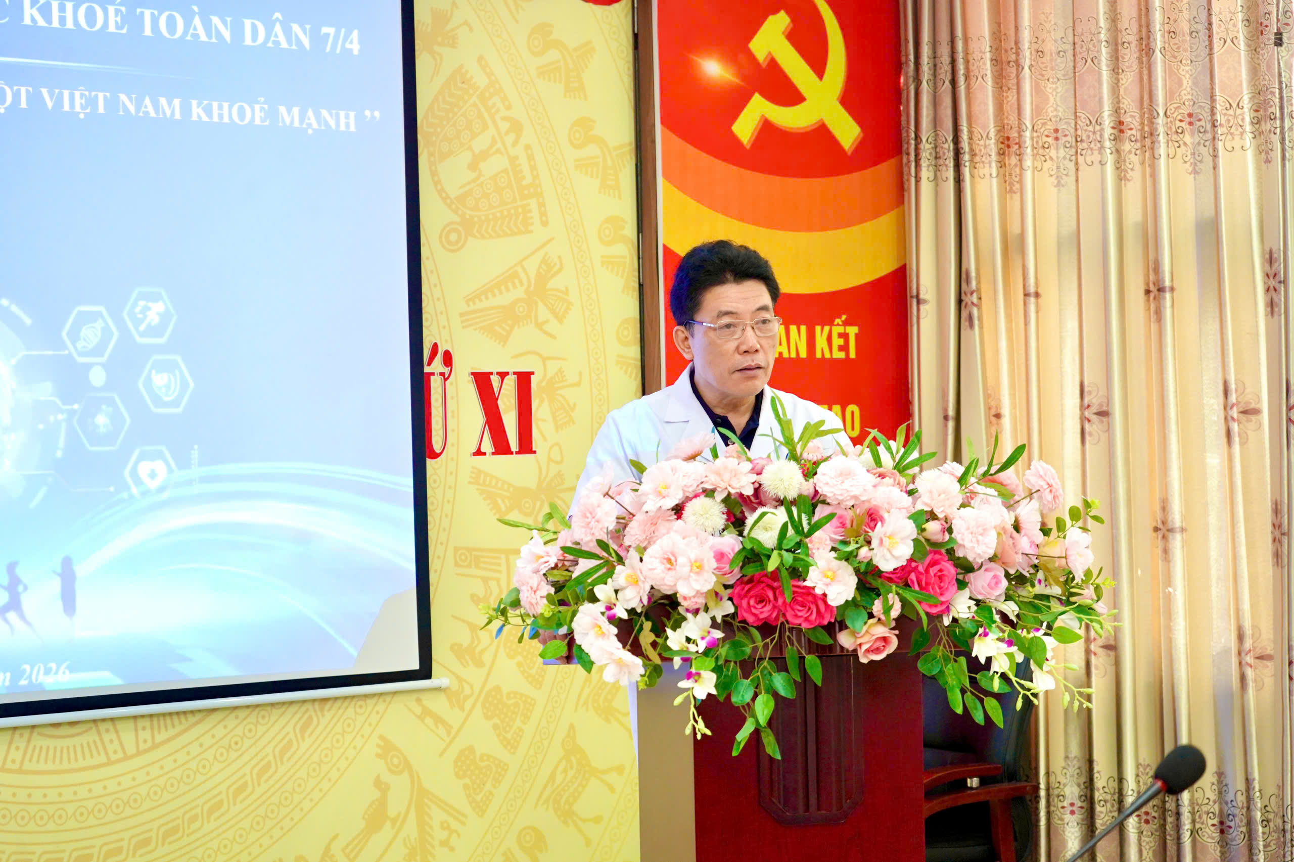 Phát biểu tại buổi lễ, lãnh đạo Bệnh viện đã nhấn mạnh các thông điệp và mục tiêu lớn trong năm nay. Đối với mục tiêu toàn cầu, bệnh viện hưởng ứng Ngày Sức khỏe Thế giới 2026 với chủ đề "Hành động toàn cầu vì bao phủ chăm sóc sức khỏe toàn dân". Trọng tâm của chủ đề này là đảm bảo mọi người dân đều được tiếp cận các dịch vụ y tế thiết yếu từ phòng ngừa, điều trị, phục hồi chức năng đến chăm sóc giảm nhẹ, mà không gặp khó khăn về tài chính.